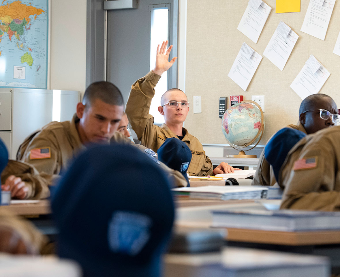 Highly structured quasi-military format beginning with the 2-week Acclimation Phase where cadets prove they have the desire and discipline to complete the program. The 20-week Challenge Phase includes rotating academic core classes Monday through Friday, daily physical training, workshops in life coping skills, job searching, health and hygiene, responsible citizenship, and leadership. Cadets must meet military grooming standards, wear military-type uniforms, and observe standard military customs and courtesies. One on-campus Family Day and two home passes are permitted during the residential phase.